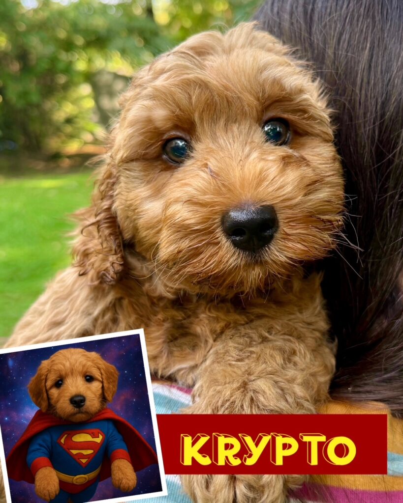 Krypto is already impressively well-mannered for his age — he’s 99% potty trained, crate trained, and has a strong foundation in basic puppy manners. He’s confident in new situations, loves playing with other dogs, and adores children. His early socialization has set him up to grow into the kind of well-adjusted companion every family dreams of.